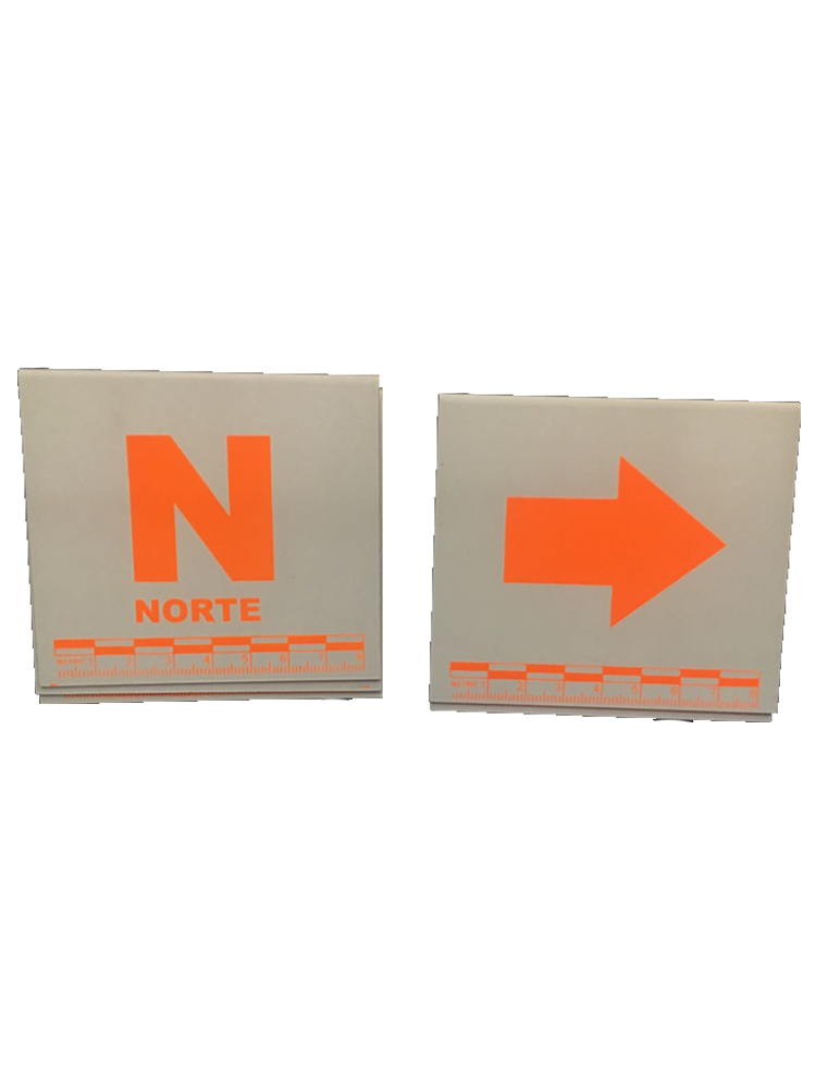 Indicadores tipo caballete de 90x75mm, fabricados en estireno cal. 40 color blanco con escala métrica de 8 cm impresos en ambas caras en tinta naranja fluorescente para resaltar en la oscuridad.