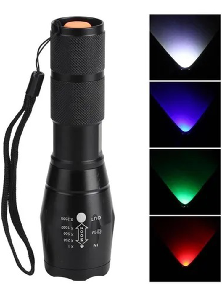 La linterna viene con modo de iluminación 4 en 1: luz blanca brillante LED, luz azul, luz verde, luz roja. El botón del interruptor de tapa trasera se convierte en modo de transmisión, y la interfaz fácil de usar puede ajustar la salida.