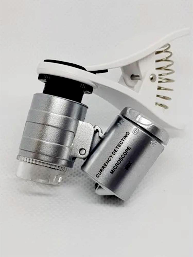 Microscopio de bolsillo 60x con luz Led y luz UV, enfoque manual, ideal para estudios de campo, serigrafía , criminalística. El producto es de plástico e incluye 3 baterías tipo botón.