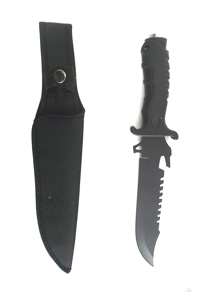 Cuchillo de monte de hoja pavonada, mango color negro con funda. Medidas: hoja: 17.78 cms. mango: 12 cms.