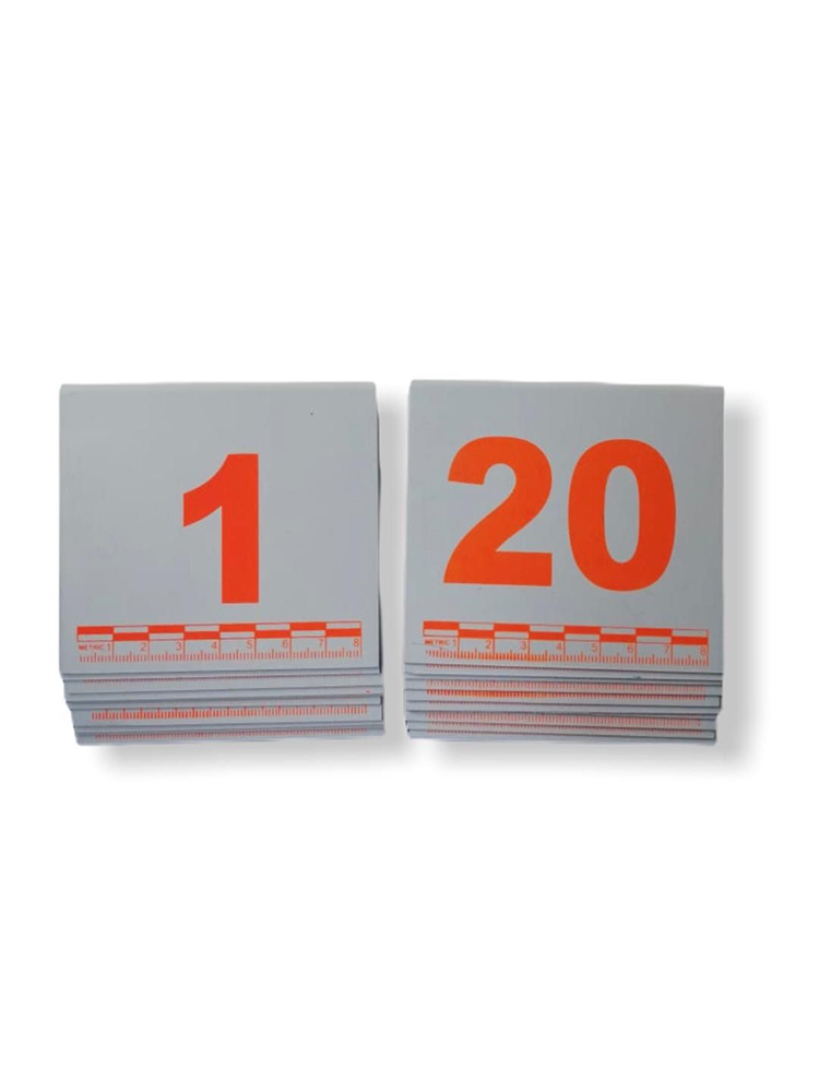 Indicadores tipo caballete de 90x75mm, fabricados en estireno cal. 40 color blanco con escala métrica de 8 cm impresos en ambas caras en tinta naranja fluorescente para resaltar en la oscuridad.