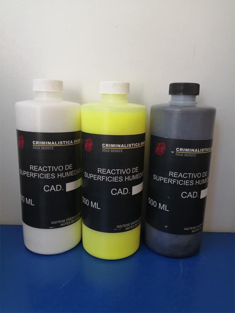 Reactivo Quimico ideal para el revelado de huellas latentes encontradas en exteriores, en superficies mojadas o húmedas, como automóviles, ventanas de vidrio, plástico o superficies metálicas, incluso oxidados, disponible en color blanco, negro y fluorescente, en presentación de 500ml.